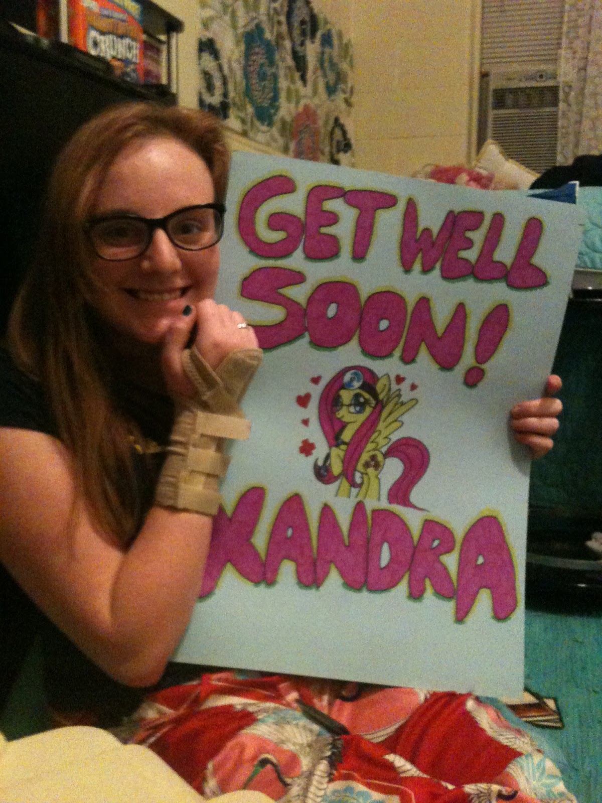 Just a cute little story for you guys tonight. A week ago, a Brony named Xandra was injured in a car accident at Stephens College in Columbia, Missouri and had to be taken to the hospital. In typically fashion for Bronies, members of the University of Missouri Brony Club put together a get well card for her!