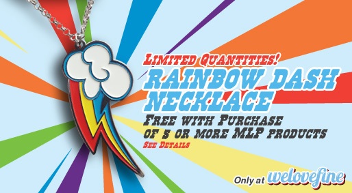 Just in case you were in the market for five or more items from Welovefine, a new promo has popped up with these limited quantity Rainbow Dash necklaces at the forefront.