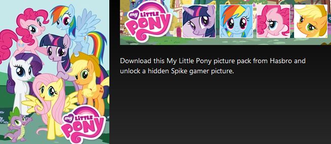 The marketplace for Xbox Live has been updated with the pictures and themes side of the My Little Pony line. It's looking like the mane 6, Luna, Cadance, and Celestia are available right now. The theme itself runs for 240 MS Points, and the picture pack at 160.