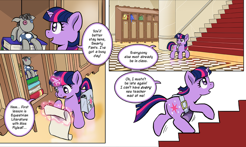 Ah nothing like waking up to find a new page of your favorite comic in the inbox! Twilight continues her first day at school and is as peppy as ever!