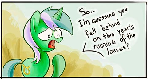 I never really thought of that. No matter how you look at it, someone is going to spend the entire running of the leaves getting blasted by leaves. Pony life is rough.