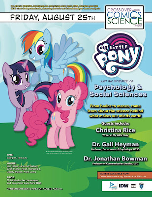Kidding aside, this Friday—August 25th—from 6:30 PM – 8:00 PM PST the San Diego Art Gallery is hosting a My Little Pony themed lecture as part of their Crossover Where Comics and Science Meet series. The event will be held at the San Diego Comic Art Gallery, which just so happens to be right next to IDW Publishing, and feature IDW MLP Comic Writer Christina Rice, Professor of Psychology Dr. Gail Heyman, and Professor of Communication Dr. Jonathan Bowman.