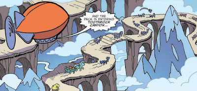 The environments are not so readily characterized. Much of the race takes place in the Equestrian/Yakyakistan border, and we do see a transition from green hills in part one to brown and blue tones in the second issue. Yet because the cold is an important factor to both Roamer's plan and a deadline for the protagonists to thwart him, I think there could have been greater emphasis on the encroaching cold. In particular, snow on the track would be a great obstacle for the race.
