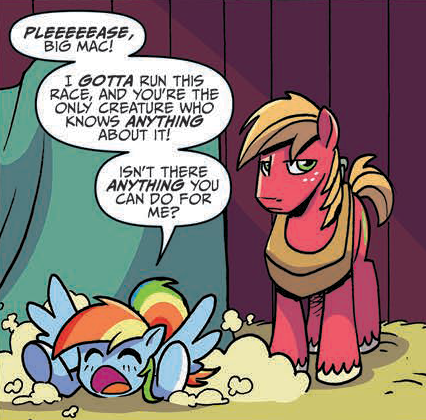Big Mac is too easy-going to initiate the story, and so he needs a push. Rainbow Dash–in both this story and the Equestria Girls collection–is a great character for initiating a story. She's one of the most extroverted, expressive, and aggressive characters. It's often her role to get characters going even if she has to push them out the door. Plus we get some buildup as we witness a one-page training montage.