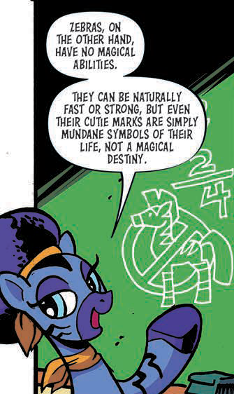 Being the only zebra we witnessed, many fans naturally assumed she represented the norm. This story is putting forth the idea that Zecora is the odd one out in both cultures. Folks asked last issue why she was more upset about returning home than she was when Twilight and friends accused her of being an evil enchantress. I think it's because Zecora has grown used to having others make assumptions about her, but having to go back and face those she viewed as betrayers was something for which she hadn't prepared.