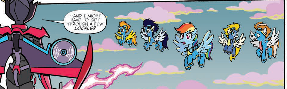 That storyline has since been abandoned, making me wonder about this chapter's timing. Much like Gauge and Pinkie Pie, this story seems to suggest that travel between the two dimensions remains open and the two cultures continue to interact. Though in this case, the interaction is more competitive as Rainbow Dash and Windblade posture over their skills.