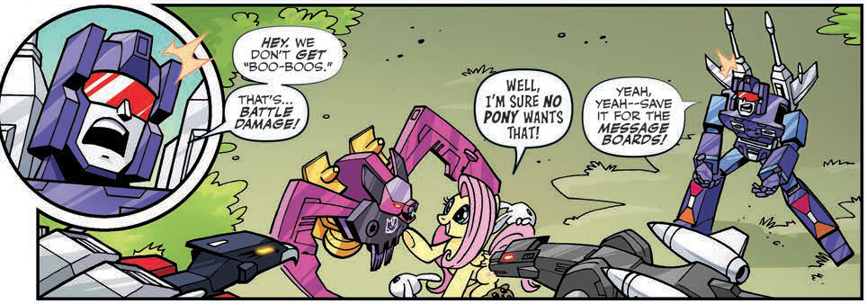Lawrence is well-practiced in drawing Decepticons, but I'm impressed by how well he contrasts them against the small and rounder ponies. Fluttershy in particular enjoys some wonderful expressions that make her a stand-out character. If one applied the same lines to a stiffer rendition, I think the character herself might seem less authentic.