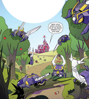Sara Pitre-Durocher returns as the artist for this confrontation and once again she shows an amazing attention to detail on both franchises. It's an interesting contrast because Pitre-Durocher's previous work with Spike and Grimlock took place in the Transformers universe. Now she is called upon to draw Sweet Apple Acres.