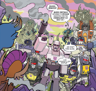 So now we have witnessed each of the Mane Six interact with a Cybertronian counterpart. Some were friends, some were enemies. Fluttershy earned several frenemies! But now it's time to pick up where we started. Chrysalis and Megatron are finally making their play.