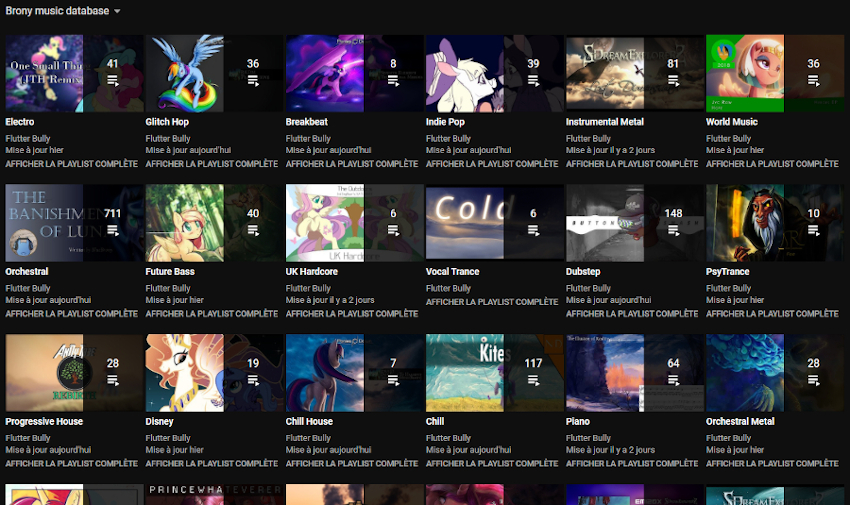 A labor of love started more than a year ago, pony musician Flutter Bully went through every single spotlight music post on EQD since their inception (and plans on going through my "More Pony Music" posts as well), and arranged their favorites into a LOT of playlists of genres! Not only showing dedication, that initiative could help you find your new favorite pony music! It's being actively worked on and updated with every new daily post, too! The database "currently has over 5500 songs, divided into 311 playlists, and is constantly growing".